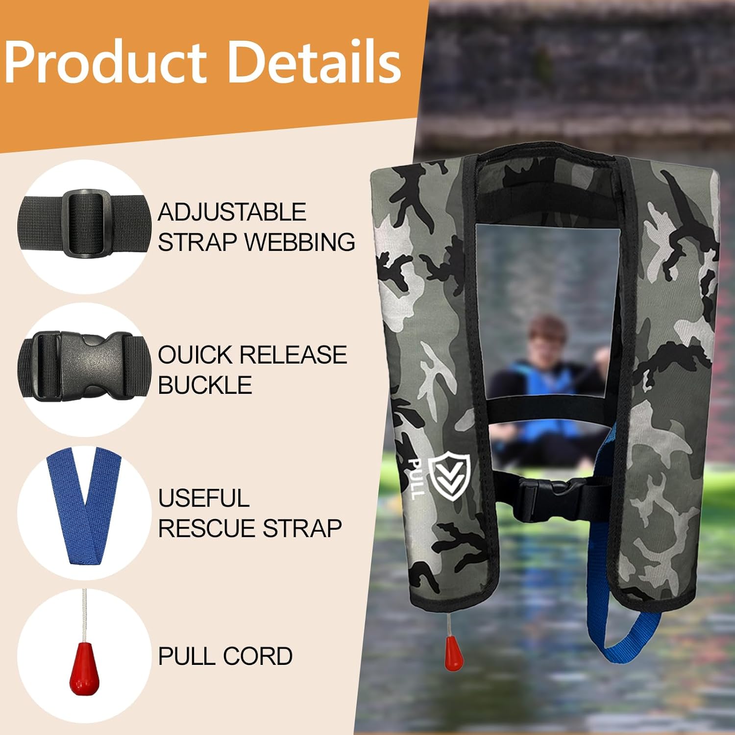Manual Inflatable Life Jacket for Adults Stay safe & comfortable with our inflatable life jackets for adults! Perfect for kayaking, fishing, boating, and water sports, this adult life jacket combines a lightweight 0.75 kg design with 150N buoyancy to keep you afloat without restricting movement. Key Features: ✅ Deploy On-Demand – Easily activate the life jacket when needed with the simple pull-cord for manual inflation, putting you in full control of your safety. ✅ Ultra-Visible & Reliable – Features 2 reflective strips and a professional-grade safety whistle for emergencies. Factory leak-tested for 48 hours to ensure airtight performance. ✅ Comfortable & Adjustable – Fits chest sizes 29-62" (73-157cm) and supports weights 80-330lbs (36-149kg). Slim-fit design ensures all-day comfort. ✅ Quick Storage & Reuse – Includes an oral inflation tube and easy-deflate valve for compact packing. Replaceable CO2 cylinder (sold separately) for long-term use. ✅ Multi-Activity Use – Ideal as a kayak life jacket for adults, fishing life jacket, or PFD for paddleboarding, sailing, and boating. Comes with a PVC mesh tote bag for easy carrying. Designed for Safety & Convenience: This PFD life jacket for adults ensures automatic head-righting to keep your face above water and includes rescue loops for quick retrieval. Whether you're an angler, kayaker, or boater, this inflatable life vest delivers professional-grade protection without bulk. Package Includes: 1x Inflatable Life Jacket, 1x 33g CO2 Cylinder, 1x Safety Whistle, 1x PVC Storage Bag,1 x oral inflation tube